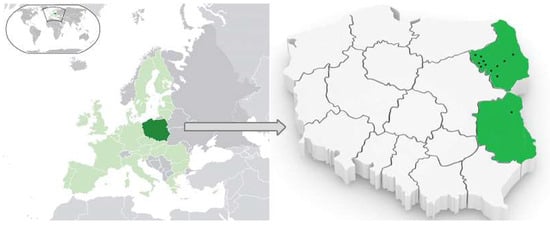 Localisation of tested organic and conventional farms in eastern Poland. Study area was marked in green (Poland location on the left and 2 voivodeships of eastern Poland (Podlaskie and Lubelskie) on the right with tested farms marked with dots).