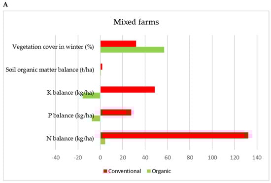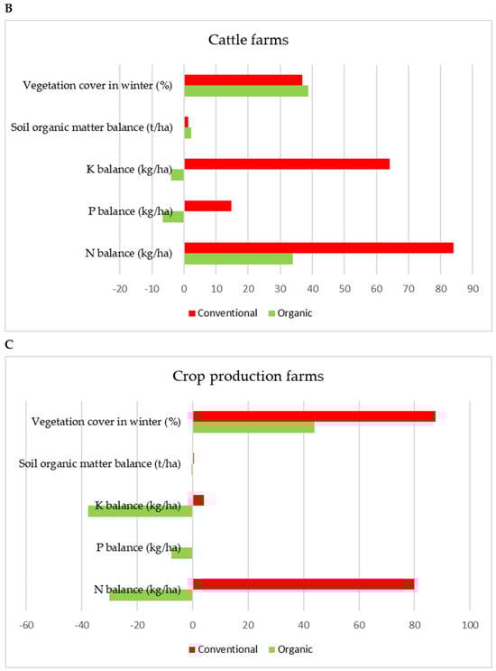 The main agri-environmental indicators identifying possible threats to the environment from farms differing in production systems and production specialisation are presented in Figure 2A–C. The balance of nutrients (NPK) of the groups of farms according to production systems and directions varied. Significant excesses of three macroelements (N, P, K) were exhibited by conventional mixed farms without specialisation (Figure 2A) and farms specialising in cattle production (Figure 2B), indicating their potentially negative environmental impact from their production. Conventional farms without livestock (Figure 2C) also had similarly high nitrogen balance surpluses. Negative phosphorus and potassium balances were found in all groups of organic farms, and additionally nitrogen deficiency was found in organic farms with crop production (Figure 2A–C). The presented indicators show that the implementation of optimal nutrient management on many farms, regardless of the production system, still leaves much to be desired. All farm groups, except the organic farms specialising in crop production, had a positive organic matter balance (Figure 2A–C). The evaluation of the analysed farm groups, in terms of the index of soil cover with vegetation in winter, varied. The share of these plants in the arable land area was higher than 32%, and it was highest in the group of conventional farms with crop production, but this indicator should be tested on the biggest group of farms.