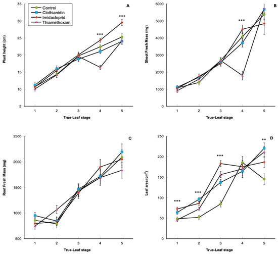 Plant height, shoot fresh mass, root mass, and leaf area increased significantly at each successive leaf stage (p < 0.001) (Figure 1). Root fresh mass was the only factor not significantly affected by leaf stage, treatment, or their interactions. Significant differences between treatments varied by crop stage. The imidacloprid-treated seedlings were significantly taller than the clothianidin and thiamethoxam treatments at the fourth and fifth true-leaf stages (Figure 1A; p ≤ 0.0001). There were no significant differences among seed treatments for seedling height at the first, second, and third true-leaf stages. At the first, second, third, and fifth true-leaf stages, there were no significant differences in shoot fresh weight within neonicotinoid-treated seedlings. However, at the fourth true leaf stage, the imidacloprid, clothianidin, and control seedlings had significantly greater shoot mass (p ≤ 0.0001) than the thiamethoxam-treated seedlings (Figure 1B). At the first, second, third, and fifth true-leaf stages, there were no significant differences in shoot fresh weight within neonicotinoid-treated seedlings; however, control seedlings were the heaviest followed by clothianidin, imidacloprid, and thiamethoxam. Leaf area was also affected by seed treatments and significant differences were found between treatments at the first, second, third, and fifth true-leaf stages (Figure 1D). In the first three leaf stages, imidacloprid and clothianidin performed similarly while thiamethoxam and untreated control had smaller leaf areas compared to imidacloprid and clothianidin. However, at the fifth true-leaf stage, clothianidin, thiamethoxam, and imidacloprid were not significantly different from each other; the control treatment had significantly less leaf area than clothianidin and thiamethoxam (Figure 1D).