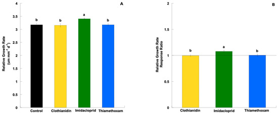 Due to the high variability across treatments and growth parameters, it was necessary to normalize plant growth data to elucidate true impacts over the course of the experiment. Therefore, RGR and RGR RR were calculated to determine temporal effects of neonicotinoid seed treatments prior to squaring and flowering as described in [14]. Cotton seeds treated with imidacloprid resulted in higher RGR and RGR RR in comparison to other neonicotinoid treatments and controls. This indicates that over the most vulnerable stages of cotton growth, imidacloprid had noticeable plant growth impacts on cotton seedlings as seedling heights increased compared to other treatments. Imidacloprid-treated cotton plants were significantly taller than thiamethoxam and clothianidin-treated plants [17]. This provides concurring evidence that imidacloprid likely provides longer-term bioactivator impacts on cotton; however, this was not directly measured. Because plant height and growth parameters can vary if initial parameters are not controlled, (i.e., uniform cutting in horticultural plants), which may not be possible for many experiments, RGR and RGR RR can serve as better indicators of treatment impacts [34]. For example, in our experiments, the impacts of clothianidin and imidacloprid were similar for many of the measured growth parameters, showing no clear indication of better performance between treatments. Thus, based on RGR and RGR RR, imidacloprid treatments more clearly influence plant height compared to other treatments and the control [30].