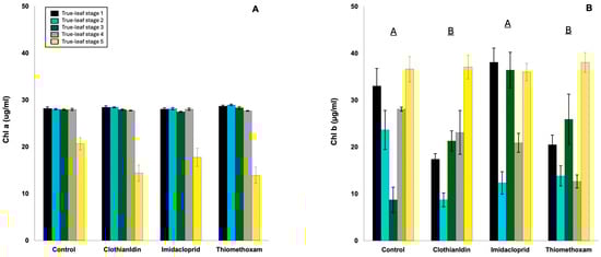 Chlorophyll a and b concentrations in different stages of leaves in both trials. (A) Chlorophyll a and (B) chlorophyll b. Different uppercase letters with brackets indicate significant effects of seed treatment at p ≤ 0.05. Bars represent ±1 standard error of the mean.