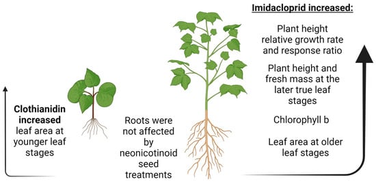 Diagram of the effects of neonicotinoids on cotton plant physiology. Image generated using Biorender.com (accessed on 5 March 2024). Arrows represent increases in plant growth parameters.