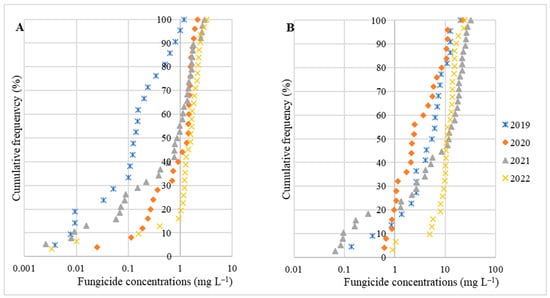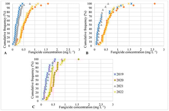 The EC50 distribution patterns of the QoI-group fungicides are presented in Figure 1. The distribution of sensitivity shows that throughout the testing period, only a few isolates had EC50 values below 1 and 0.1 mg L−1 for azoxystrobin and pyraclostrobin, respectively. As for the shift towards higher concentrations for azoxystrobin, it happened gradually, whereas for pyraclostrobin, there was a drastic shift from 2019 to 2020. In 2019, for pyraclostrobin, there were only two isolates with EC50 values barely reaching the 1.0 mg L−1 mark, but in the following years, a greater proportion of the isolates had values exceeding 1.0 mg L−1. This illustrates a great increase in the average EC50 values for pyraclostrobin.