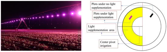 Irrigation center pivot with LEDs to provide light supplementation. Spatial distribution scheme of the experiment in the pivot operating area.