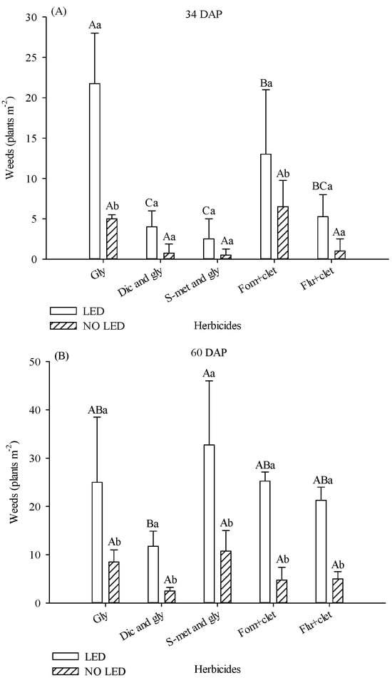At 60 DAP, the number of weeds in all areas increased. Across all herbicides, there were more weeds in the supplemented plots (Figure 2B). In the presence of LED, the treatment with diclosulam and glyphosate had fewer weeds (Figure 2B).