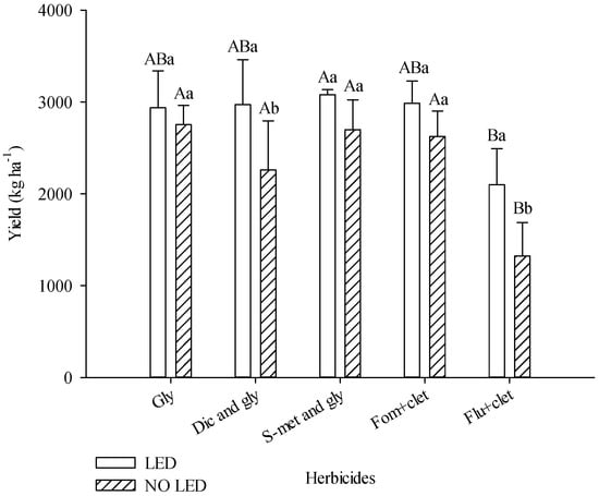 Productivity of soybeans grown under LED panels installed on the central pivot and treated with herbicides. Gly: glyphosate. Dic: diclosulam. S-met: s-metolachlor. Fom: fomesafen. Clet: clethodim. Flu: Flumioxazin. Averages followed by the same uppercase letters for herbicides and lowercase letters for the presence or absence of LED do not differ from each other, according to Tukey’s test at 5% significance. CV: 16.88%.