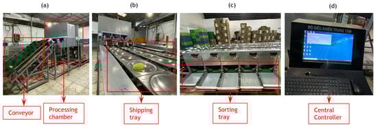 The mango sorting system, illustrated in Figure 1, comprises several integrated components that take mangoes as input and produce graded mangoes as output. Before entering the system, the mangoes undergo screening by farmers to eliminate overly small or significantly damaged ones. Then, the mangoes are placed onto the conveyor (depicted in Figure 1a) for transfer to the image processing chamber (shown in Figure 1a). In the chamber, a series of image processing algorithms are used to extract various features such as length, width, and defects of the mangoes. Subsequently, the mangoes pass through a weighing system equipped with loadcells. The signals from those sensors undergo filtration using the Kalman filter before being forwarded to the central processor for further analysis. This paper does not delve into processing signals from the loadcells. The derived weight is then combined with the external features of the mangoes to generate an essential input value for the classification model. Next, the mangoes are transferred to trays via the conveyor (shown in Figure 1b) for transportation to the grading tray area. At the sorting unit (shown in Figure 1c), mangoes of each specific type are directed to the corresponding trays by the classification system. At this point, a sorting process is completed based on central controller (Figure 1d).