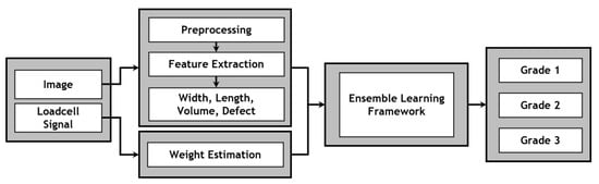 In previous studies, fruit grading was carried out with the help of electronic nose devices to estimate fruit ripeness [5]. Another study in [6] describes an automated method for peach-fruit maturity grading using spectroscopy-based sensors and multivariate processing to reduce the operator’s intervention. By estimating fruit firmness through spectral data and employing a fuzzy classifier, the system offers reliable maturity categorization despite fruit variability. Those studies mainly involve maturity estimation via a non-vision-based approach. However, those systems have limitations in evaluating fruits on a large scale within a short time because the implementation process is quite complicated and requires a large amount of labor. Therefore, some subsequent studies have proposed fruit classification systems based on machine vision to improve classification accuracy. Machine learning (ML) algorithms are widely used in the field of computer vision to classify agricultural products due to their adaptability to many conditions. In Reference [7], Nandi et al. introduce an automated mango grading system that assesses maturity and quality based on shape and surface defects using machine vision. It categorizes mangoes into four groups, considering market distance and value, employing image processing and support vector regression for maturity prediction, and a fuzzy algorithm for grading. That study achieves an impressive 87% accuracy, and the system also demonstrates 100% repeatability. The effectiveness of ML algorithms in the fruit classification process has also been shown in some other studies. The authors in [8] present how to use visible images to grade mangoes based on their shapes, with a 98.3%-correct classification using discriminant analysis and a 100%-correct classification using support vector machines (SVMs). Furthermore, the study shows a good correlation of 94.0% between estimated and actual values by applying the cylinder approximation analysis method, which can be used to predict mango weight from images. A 95% accuracy in weight grading is produced by the derived formula, w = 2.256V − 157.7, where w is the predicted weight in grams and V is the estimated volume. That method shows that the simple approach to predicting fruit weight and volume is effective. Another study also applied ML to fruit classification. Schulze et al. [9] compare three models—simple linear regression (SLR), multiple linear regression (MLR), and artificial neural networks (ANNs)—for estimating the mass of mango fruits based on their features. Using independent datasets for calibration and validation, the study established a high-performance model suitable for mass–size estimation in machine-vision systems. ANNs emerged as the most accurate model, displaying robustness with a root-mean-squared error (RMSE) of 6.55 g, a mean absolute percentage error (MAPE) of 1.62%, and a coefficient of efficiency (E) of 0.99 during validation, making it the preferable choice for mango-mass estimation, with a success rate of 96.7%. In study in [10], the authors introduce an image processing system that automatically categorizes rice grains based on their commercial value by segmenting grains from the background, extracting key features, and using SVMs for classification. The experimental results of that study demonstrate the method’s effectiveness in accurately classifying grain samples. Agricultural product classification systems that apply ML are effective, but they are not powerful enough in complex cases [11]. Therefore, some researchers have proposed new classification systems using deep learning (DL) algorithms. Specifically, in research described in [11], Cao et al. present LightNet, a novel convolutional neural network (CNN) architecture designed to efficiently classify fresh zizania into high- and defective-quality categories. LightNet’s compressed block design reduces computational complexity by converting serial operations to a parallel structure, achieving 95.62% accuracy in zizania grading at a speed of 47 ms per image. Despite having fewer parameters and lower complexity than other networks, LightNet maintains comparable accuracy in zizania grading and achieves 99.31% accuracy in grading apples. In addition, the authors of a study in [12] introduced CNNs and transfer learning for seed-quality classification, showing that deep learning (specifically GoogLeNet) achieved a significantly higher accuracy of 95% compared to 79.2% using traditional machine learning (SURF+SVM). However, those DL algorithms often have a large number of computations, making classification systems with limited computational resources incapable of operating in real time. In addition, although the ML algorithms studied in [8,9,10,11] have less computation than DL, they were developed individually. That cannot take advantage of the different strengths of ML algorithms to achieve the best result. Furthermore, recent studies have primarily concentrated on developing intelligent algorithms for quality classification without providing comprehensive system research. Therefore, this research aims to construct a complete mango classification system and analyze the algorithms employed to extract external features, which are subsequently fed into the model for predicting mango quality. Notably, our proposed ensemble-learning model rectifies the limitations observed in the previous studies. Initially, various machine learning algorithms underwent evaluation using mango classification data. The most robust algorithms were then compared, followed by hyperparameter tuning aimed at enhancing accuracy. Subsequently, different ensemble-learning (EL) methods—such as bagging, boosting, and stacking—were applied to increase the individual model’s performance. Ultimately, the most robust model was integrated into the system.