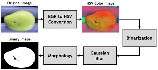 In the image processing chamber, environmental conditions were established and adjusted to create favorable settings for subsequent processing steps. The setup is crucial for generating an input image with reduced noise and ensuring optimal conditions for image binarization. In the captured image (as shown in Figure 3), the green of the mangoes stands out against the background, facilitating segmentation. Subsequently, the captured HSV image (IHSV), is converted into a binary image (IB), as described in Equation (4). In the color space conversion, a range of values corresponding to the green color in the HSV color space is selected, with a lower bound of Tmin(H,S,V) = (30,15,17) and an upper bound of Tmax(H,S,V) = (80,255,255). Following the process, the resulting binary image comprises pixels with a value of 255, representing the color area of the mango, while a value of 0 corresponds to both the background and the mango’s defect area in the original image. Subsequently, a Gaussian blur filter with a kernel size of 3 × 3 is applied to smooth the binary image. Additionally, a dilate morphology method is utilized to eliminate noise in the binary image. The binary image outcomes of this process are illustrated in Figure 3.