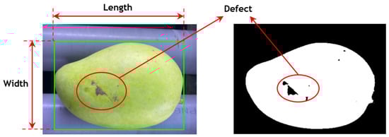 A similar calculation for Equation (8) is applied to calculate the length value of the mango. Notably, the defects in the mango are recognized by the area of zero-valued pixels within the mango’s boundary in the binary image. This area is determined by the pixel-size ratio k where each pixel represents an area of k2. Equation (10) is used to calculate the actual defect value.