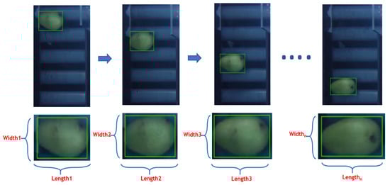 The shape of the mango, which varies by country and area, affects the assessment of volume. Consequently, the shape is extracted before the volume is estimated. Structured data that have been transformed from images and sensor signals make up the appropriate data for training models. There are three stages involved in volume estimation. A camera extracts the length, width, and defect from the collected image in the first stage. The volume is estimated using the length and width, and its errors are assessed in the second stage. In the end stage, the length, width, volume, and defect are added to the weight to obtain a completed dataset. Figure 5 shows a series of captured images to extract external features.