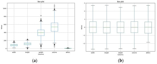 Figure 7a shows the distribution of mango features. Figure 7a reveals that the mean values of the features increase in order from defect (5.14), width (85.77), length (118.2), weight (397.15), and volume (539.69). The mean value of volume reaches the largest value because it is calculated from many different features. A similar trend is also observed with the interquartile range (IQR) value when the defect is the smallest value, from 3.09 to 6.98, and the volume is the maximum, from 429.61 to 641.61. In addition, data points outside the maximum and minimum values are considered outliers. Those outliers are removed to facilitate the training process by the IQR method. After this process, the new distribution of the data is shown in Figure 7b, with the values of the features normalized with a mean of 0 and a standard deviation of 1.
