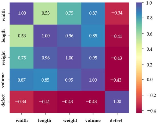 As illustrated in Figure 8, a heatmap is used to graphically depict the relationships between a variety of input parameters. The correlation coefficient, which measures the degree and direction of a relationship between two variables, is represented by each individual feature in the dataset. The degree of linear association between variables is shown by the correlation coefficient, a numerical value that ranges from −1 to 1. Values around 1 or −1 indicate a strong positive or negative linear relationship, respectively, whereas values near 0 indicate no linear relationship. In the context of this study, the heatmap demonstrated a positive linear relationship between the width, length, weight, and volume features. Meanwhile, the defect feature shows no relationship with the remaining features, because the defect’s correlation coefficient value compared to the remaining features is approximately zero.