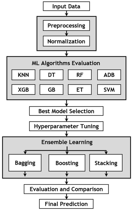 This section presents the process of building and evaluating the model. This method involves several steps aimed at enhancing the model’s accuracy. Initially, the data undergo preprocessing to transform label values from strings to numbers. Subsequently, outlier detection and removal are performed on all features to reduce noise in the data. The data are then normalized to create optimal conditions for effective model training. Once this preparation is completed, the data are ready for input into the model. At this stage, eight ML models are selected for evaluation using the prepared dataset. The evaluation of these models is conducted independently by employing the Kfold cross-validation technique to ensure more accurate results. Following this stage, the outstanding algorithms are chosen, and hyperparameter tuning techniques are applied to enhance the performance of each model. Additionally, ensemble methods such as boosting, bagging, and stacking are employed to capture the intricate relationships within the data. Finally, these ensemble models undergo evaluation and comparison with each other to identify the most suitable model for the dataset in this study.