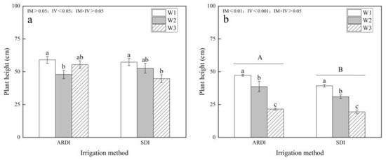 The impact of irrigation methods (alternate partial root-zone drip irrigation and subsurface drip irrigation) and irrigation volumes (W1, W2, and W3) on the height of alfalfa crops harvested in successive cuts from 2022 to 2023. The labels (a,b) in the figure correspond to the data for the 1st and 2nd cuts of alfalfa in 2022, respectively, while (c,d) correspond to the 1st and 2nd cuts in 2023. All values represent mean measurements obtained from replicated trials, accompanied by standard errors. Capital letters in the figure indicate significant differences between irrigation methods (IM < 0.05), while lowercase letters denote significant differences between irrigation volumes within each irrigation method group (IV < 0.05). In figures where the interaction between irrigation method and volume is significant (IM × IV < 0.05), lowercase letters indicate significant differences among variables based on simple effects analysis (p < 0.05).