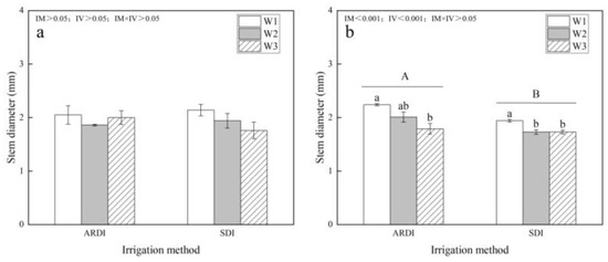The impact of irrigation methods (alternate partial root-zone drip irrigation and subsurface drip irrigation) and irrigation volumes (W1, W2, and W3) on the stem diameter of alfalfa crops harvested in successive cuts from 2022 to 2023. The labels (a,b) in the figure correspond to the data for the 1st and 2nd cuts of alfalfa in 2022, respectively, while (c,d) correspond to the 1st and 2nd cuts in 2023. All values represent mean measurements obtained from replicated trials, accompanied by standard errors. Capital letters in the figure indicate significant differences between irrigation methods (IM < 0.05), while lowercase letters denote significant differences between irrigation volumes within each irrigation method group (IV < 0.05). In figures where the interaction between irrigation method and volume is significant (IM × IV < 0.05), lowercase letters indicate significant differences among variables based on simple effects analysis (p < 0.05).