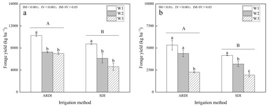 The impact of irrigation methods (alternate partial root-zone drip irrigation and subsurface drip irrigation) and irrigation volumes (W1, W2, and W3) on the fresh forage yield of alfalfa crops harvested in successive cuts from 2022 to 2023. The labels (a,b) in the figure correspond to the data for the 1st and 2nd cuts of alfalfa in 2022, respectively; (c,d) correspond to the 1st and 2nd cuts in 2023; and (e,f) correspond to the annual data for alfalfa for the years 2022 and 2023. All values represent mean measurements obtained from replicated trials, accompanied by standard errors. Capital letters in the figure indicate significant differences between irrigation methods (IM < 0.05), while lowercase letters denote significant differences between irrigation volumes within each irrigation method group (IV < 0.05). In figures where the interaction between irrigation method and volume is significant (IM × IV < 0.05), lowercase letters indicate significant differences among variables based on simple effects analysis (p < 0.05).