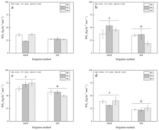 The impact of irrigation methods (alternate partial root-zone drip irrigation and subsurface drip irrigation) and irrigation volumes (W1, W2, and W3) on the water productivity of irrigation of alfalfa crops harvested in successive cuts from 2022 to 2023. The labels (a,b) in the figure correspond to the data for the 1st and 2nd cuts of alfalfa in 2022, respectively; (c,d) correspond to the 1st and 2nd cuts in 2023; and (e,f) correspond to the annual data for alfalfa for the years 2022 and 2023. All values represent mean measurements obtained from replicated trials, accompanied by standard errors. Capital letters in the figure indicate significant differences between irrigation methods (IM < 0.05).