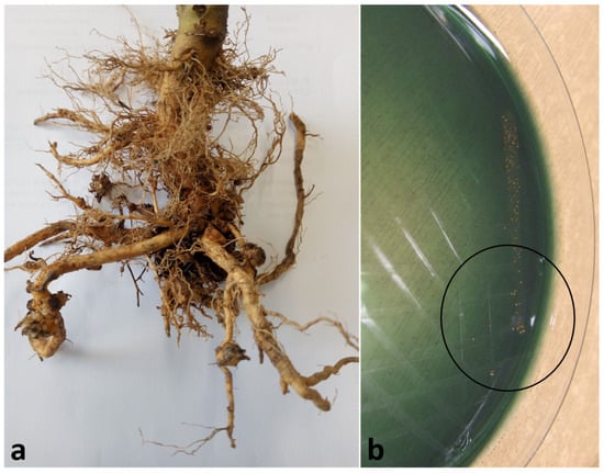 In 2020, crown gall symptoms were observed on the roots of tobacco plants (hybrid PVH2310, ProfiGen do Brasil Ltd.a., Santa Cruz do Sul—RS, Brazil) grown in the Golubinci (Srem district, Serbia) production fields. Meteorological data were taken from the nearest meteorological station, Sremska Mitrovica, distanced 35 km from the sampling location. The average values of the three-decade air temperatures during the tobacco vegetation period (May–October) were similar to the annual average temperature, with the highest deviation being 1.4 °C in May (Scheme 1a). The total precipitation was lower in July and September, and higher in August and October compared to the perennial average for the observed tobacco vegetation period. Double the perennial average of precipitation was recorded in August (Scheme 1b).