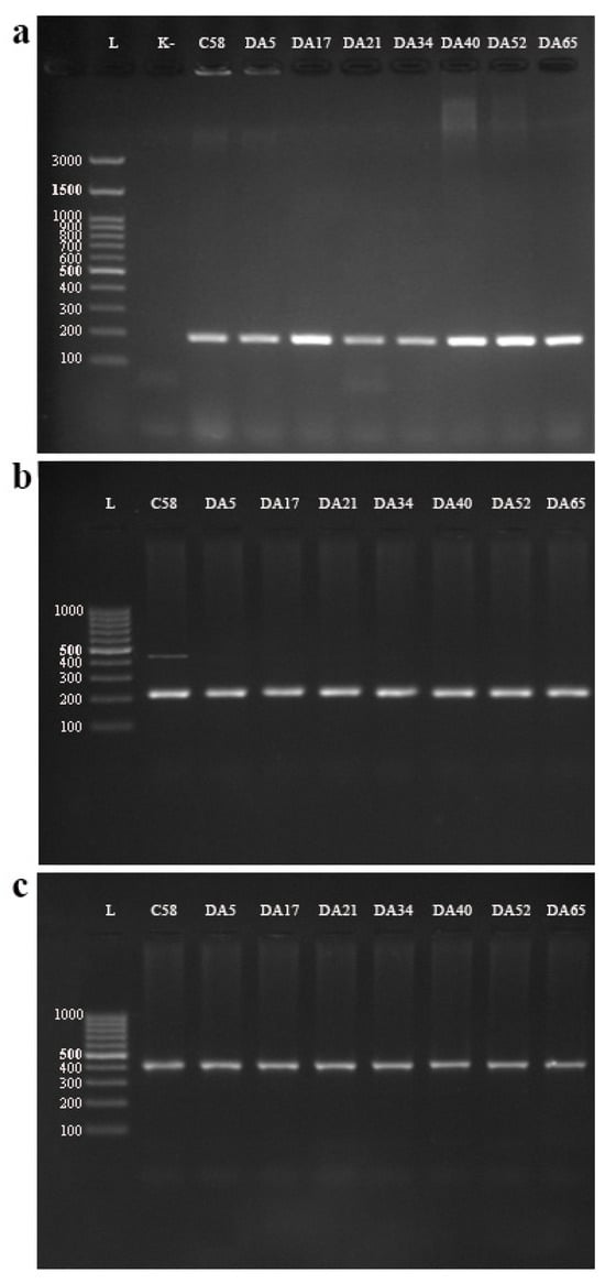 (a) Multiplex-PCR detection of Agrobacterium species/biovars using primers UF + B1R + B2R + AvR + ArR; (b) PCR detection of virulence genes virD2 and ipt, using primers A/C and CYT/CYT, respectively; (c) PCR detection of virulence genes virC and pehA, using primers VCF3/VCR3 and PGF/PGR, respectively. Letter “L” represents DNA ladder—(a) GeneRuler 100 bp Plus DNA Ladder (Thermo Scientific™) and (b,c) GeneRuler 100 bp DNA Ladder (Thermo Scientific™).