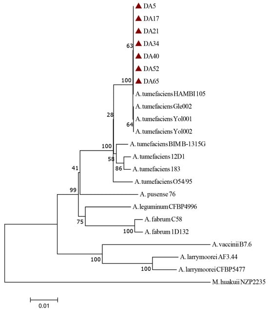 Neighbor-joining phylogenetic tree based on the concatenated sequences of 16S rRNA and the housekeeping genes atpD, dnaK, glnA, and rpoB for the seven Serbian tobacco isolates obtained in this study (marked with red triangles) and the 15 strains of different Agrobacterium spp. sourced from the NCBI database. The tree was rooted with M. huakuii NZP2235 from the NCBI.