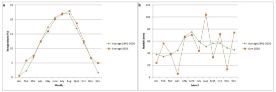 Meteorological data for sampling site: (a) Average monthly temperatures recorded for the period 1991–2020 and average monthly temperature in 2020; (b) Average monthly sum of precipitation recorded for the period 1991–2020 and the average sum of monthly precipitation in 2020.