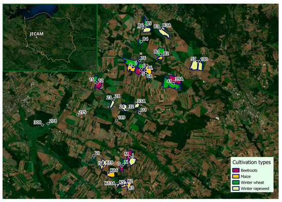 These cultivation and harvesting timelines were synchronized with the JECAM field campaigns, conducted from April, marking the onset of the vegetation season, until early July. The selection of 42 fields during the initial campaign formed the basis for the continuous monitoring of plant conditions throughout the growth period, covering each vegetation season over the span of six years. These fields comprised 15 winter wheat fields, 12 rapeseed fields, 10 maize fields, and 5 sugar beet fields. The geographical coordinates of the selected points were recorded using GPS receivers, facilitating precise spatial referencing for subsequent analyses. The distribution of the measurement fields within the JECAM area in the Wielkopolska Voivodeship is illustrated in Figure 1.