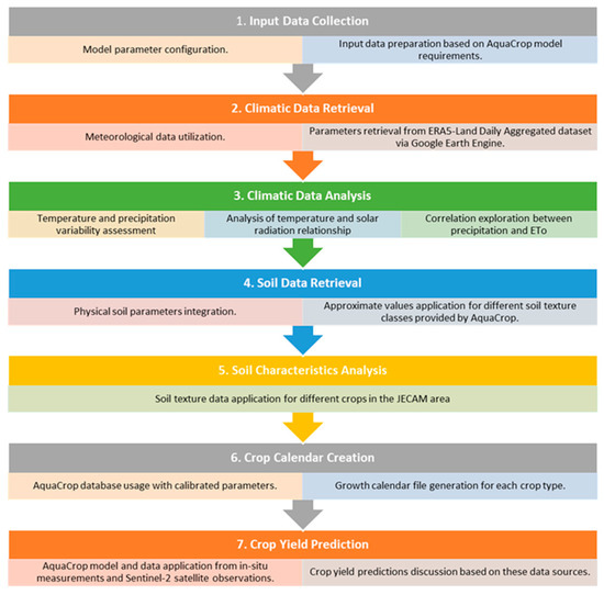 This section provides details regarding the methodology (Figure 2) used for acquiring predictive data based on the AquaCrop model and input data obtained from various sources.