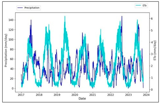Daily values of atmospheric precipitation and ETo for the years 2018–2023.