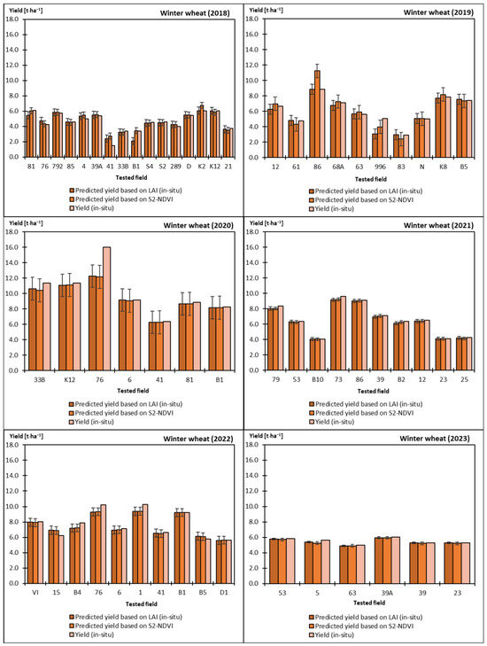 Table 2 presents the statistical analysis of in-situ yield values and simulation results obtained from the in-situ LAI and NDVI data for winter wheat. The research indicates that the ground-based LAI results yield higher error values compared to those based on satellite-derived NDVI, a trend observed for four out of six studied years. This suggests that a predictive model relying on ground-based LAI data may exhibit a relatively limited accuracy compared to a model utilizing satellite-derived NDVI.