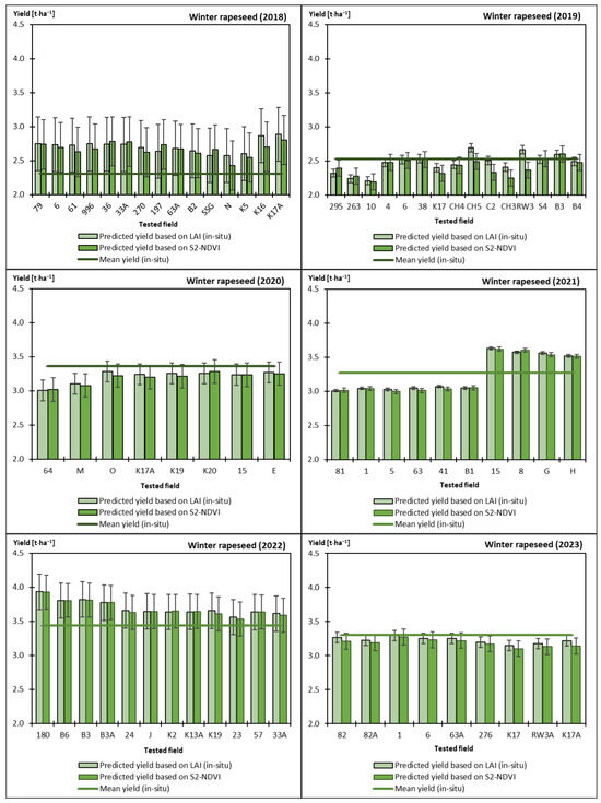Approaching Figure 6 from a general perspective, it is evident that there exists an average measured value across all years, with estimated values for rapeseed yield prediction closely aligning with this average. Upon closer examination, the RMSE values of 2018 and 2022, at 0.39 and 0.23 , respectively, highlight that the prediction outcomes for these years deviate significantly from the mean measured value, indicating a lower level of reliability compared to the simulation results for other years. Conversely, simulation results for winter rapeseed in the years 2019, 2021, and 2023 demonstrate a remarkable level of precision, with an RMSE value below 0.1 . These results indicate that the predicted values closely approximate the observed values, showcasing a higher level of reliability compared to other outcomes.