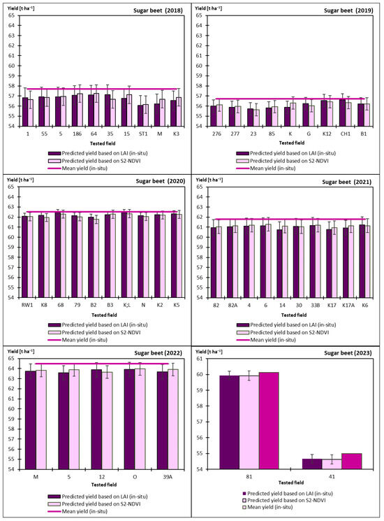 In-situ LAI and NDVI-based on observed and projected yields for the sugar beet crop type from 2018 to 2023.