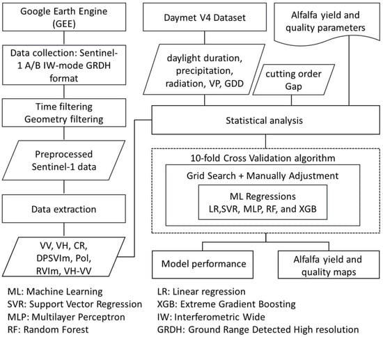 Therefore, this study aims to investigate the potential of two types of stably acquired data, satellite radar data (Sentinel-1) and environmental factors, in estimating alfalfa DMY and quality traits. For this purpose, the objectives are itemized as follows: (1) evaluating the significance of SAR data and environmental factors in explaining the variations of alfalfa DMY and quality traits; (2) evaluating the performance in estimating alfalfa yield and quality traits using Sentinel-1 SAR features and environmental factors; (3) comparing the estimation accuracy for each of the alfalfa traits among machine learning models.