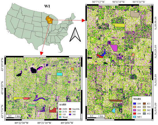 The study was conducted from 2013 to 2021 at the Arlington Agricultural Research Station (AARS, latitude of 43°16′ N to 43°20′ N and longitude of 89°19′ W to 89°24′ W) and Marshfield Agricultural Research Station (MARS, latitude of 44°43′ N to 44°48′ N and longitude of 90°04′ W to 90°08′ W) at the University of Wisconsin-Madison. From 2016 to 2021, ground data (i.e., alfalfa DMY, CP, ADF, NDF, and NDFD) were collected from seven sites at AARS and nine sites at MARS. The geographic locations of the research stations and the distribution of the sampling sites are shown in Figure 2. Alfalfa in each site was sampled three to four times in each growing season starting from the first year and extending to three years after seeding. The detailed sampling times for all the sites are listed in Table 1. The first cut (sampling) of individual sites in a year usually happened at the end of May; there was a roughly one-month interval between two cuts. Therefore, the second, third, and fourth cuts happened at the end of June, July, and August, respectively. In total, 126 samples were collected for measuring alfalfa DMY and quality traits, categorized by the sites, years, and cutting orders. Due to the limited and uneven numbers of samples for each alfalfa variety, we did not discuss them separately in the subsequent analysis, and treated the variety as a random factor.