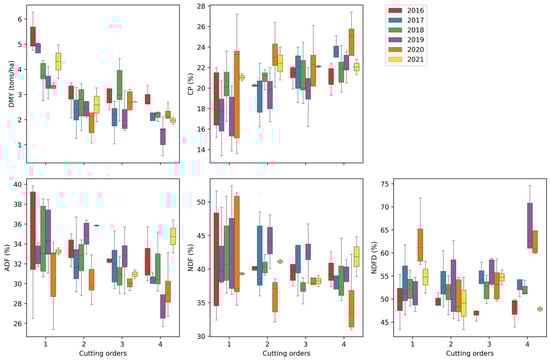 Distributions of DMY and quality traits for alfalfa harvested in each year from 2016 to 2021 are plotted against the cutting orders in Figure 3. The DMY decreased with increasing cutting order in all years, with the first cut yielding significantly higher than each of the others. This is because the growth duration for the first cut of alfalfa was significantly longer than the others, from the end of the last season (September) to May of the next year, allowing more biomass accumulation [4,45]. Besides this, when alfalfa plants were cut, they utilized the stored energy reserves in their roots to regrow and produce new shoots. Multiple cuts in a growing season led to a gradual decrease in these energy reserves, reducing the plant’s ability to produce as much dry matter in subsequent cuts [46]. Moreover, changes in environmental conditions, such as temperature, precipitation, and radiation duration, could jointly impact the plant’s ability to produce dry matter in subsequent cuts. While the DMYs of the second cuts were relatively stable over the years, the third cuts had a trend of DMY increase, with high variation. In some years (e.g., 2016, 2018, and 2020), the third cuts yielded more than the second cuts, while in some years (e.g., 2017 and 2019), they were much lower. These variations could have been caused by the weather changes in the month.