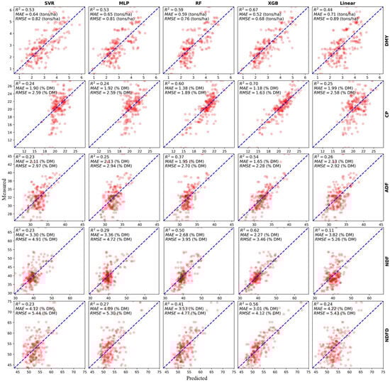 Variations among alfalfa DMY and quality traits explained by the cutting order, weather data, and SAR features are listed in Table 4. With the addition of SAR features, the explained variations in DMY, ADF, NDF, and NDFD were improved to 66.68%, 51.05%, 53.73%, and 48.67%, respectively. For the DMY, VV, VH, and VH-VV had significant effects, but their interaction with the cutting order did not. This implies that the effect on DMY of these features remained consistent during the different regrowth stages. Among the fiber contents, NDFD is the only one that has been significantly affected by the SAR feature CR. Although the explained variations were increased in ADF and NDF, none of the SAR features had significant effects. Comparing these results to those in Table 3, it can be seen that the SAR features help with explaining some of the variations in alfalfa DMY and fiber contents that were not explained by the weather data alone in the ANOVA analysis. The remaining variations could have been caused by other factors that were considered random in this analysis, such as soil type, fertilizer application, and pest management, or could be captured by the linear relationship. Therefore, in the following sections, we will evaluate the performance of ML models in representing and estimating alfalfa DMY and quality traits.