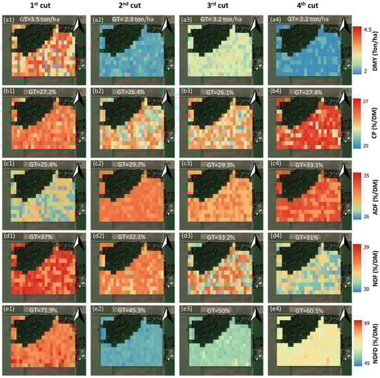 Alfalfa yield and quality maps of Sutcliffe field generated using the XGB model. (a1–e4) Maps of DMY, CP, ADF, NDF, and NDFD, respectively. GT: ground truth. Background image: Google Earth.