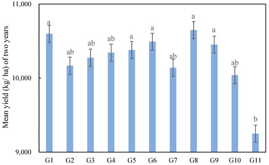 Mean yield (kg/ha) of 11 maize hybrids over two years. Different letters indicate significant differences (p < 0.05).