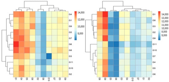 The mean yield of 11 maize hybrids under 10 locations was assessed (Figure 1 and Figure 2, Table 4 and Table 5). The results showed that, in terms of the environment, whether it was in 2022, 2023, or over the two years, these locations (E4, E1, E8, E9, and E3) had higher maize yields (Table 4 and Table 5). For the varieties, the yield ranged from 9398 kg/ha to 11,194 kg/ha, where G8, G6, G4, G5, and G9 were the five most productive varieties in 2022, while G1 performed the best, followed by G3, G9, G2, and G8 in 2023 (Table 5). Moreover, the two years of data showed that G8, G1, G6, G9, and G5 were the top five performers, which was in great agreement with the yield results of the two years alone (Table 4). Moreover, the 10 tested hybrids had higher average yields than the control (Figure 1, Table 4). In order to reflect the yield fluctuation more clearly, a clustering heat map of the yield was made (Figure 2). All these results showed that G8, G1, G9, G6, and G5 were more productive, and E4, E8, E3, E1, and E9 were suitable for breeding high-yielding varieties.