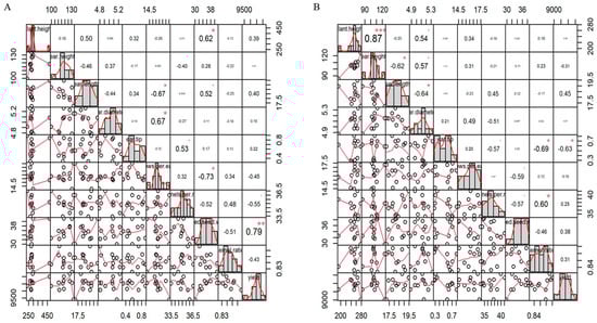 Description and correlation analysis of each trait. Note: (A), 2022; (B), 2023. ***, ** and * represent p < 0.00, p < 0.01 and < 0.05 in the upper panel, respectively. The lower panel shows scatter plots for each pair of traits. The distribution of each phenotype is shown along the diagonal.