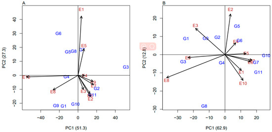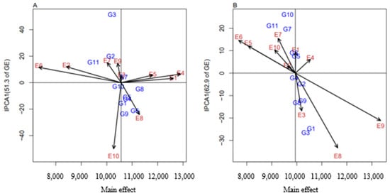 GEIs can reveal the contribution of new varieties to performance and influence breeding programs and resource allocation [6]. Crops are affected by genotype–environment interactions (GEIs), which are caused by variations in the environmental conditions [7]. In multi-site trials, often due to GEIs, variety selection is inefficient and the relative ranking of varieties varies according to the environment. So, it is necessary to analyze the interaction caused by GE effects on yield [8].