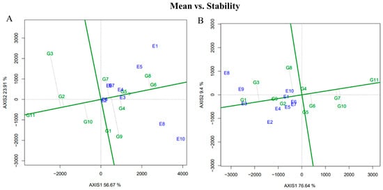 The analysis of “mean vs. stability” was conducted by the GGE biplot with an average environmental correction (AEC). The shorter the vertical segment between the variety and the AEC axis, the more stable the variety is. In the study, G6, G8, G5, G4, and G9 were more productive, while G11, G5, G6, G2, and G4 and were more stable in 2022 (Figure 7A); additionally, G1, G3, G9, G2, and G8 had high yields, while G9, G11, G1, G2, and G4 were more stable in 2023 (Figure 7B). Hence, these results showed that G5 (DY-519), G6 (JG-18), and G4 (DY-213) were the best varieties with excellent yield performance and wonderful stability in 2022, while they were G1 (ZF-2208), G9 (LX-24), and G2 (ZF-2209) in 2023.