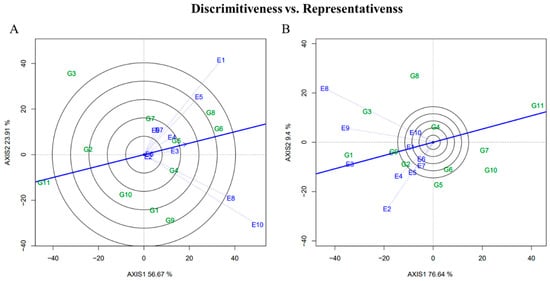 The discriminative power and representativeness of the environment were assessed by the GGE biplot in Figure 8. A site with a long vector length and a small angle to the ACE axis can be considered as an ideal environment for variety selection. In this study, E10, E1, E8, and E5 were highly discriminative, while E6, E2, E3, and E4 were more representative in 2022 (Figure 8A); E8, E9, E3, and E2 were highly discriminative, while E3, E1, E9, and E4 were highly representative in 2023 (Figure 8B). Therefore, these results indicated that E3 (Gengma) and E9 (Yongsheng) were the best environments with good discrimination and representation in 2023.