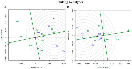 In the ranking GGE biplot, if the variety or site was located closer to the first concentric circle, they were considered for selection. From Figure 9, G6 and G1 were in the first concentric circle of their respective biplot; followed by G8, G5, G4, and G7 in 2022 (Figure 9A); and G3, G9, G2, and G8 in 2023 (Figure 9B). Thus, the results declared that G6, G1, G8, G3, G9, and G5 were the pretty satisfying genotypes.