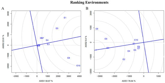 Ranking of environments under the GGE biplot. (A) GGE biplot in 2022; (B) GGE biplot in 2023. Refer to Table 1 for the environment codes.