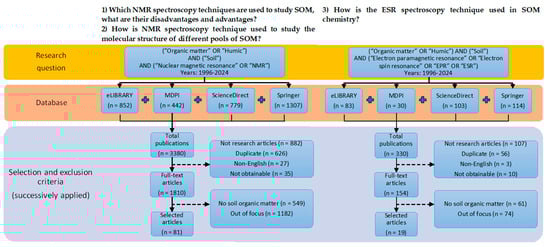 Relevant studies were searched in four databases: eLIBRARY, MDPI, ScienceDirect and Springer (Figure 1). Keywords were searched in the title of articles, abstract and keywords. The following keywords were used: “organic matter” and “humic” in combination with “soil”, “nuclear magnetic resonance”, “electron paramagnetic resonance”, “electron spin resonance” and their abbreviations “NMR”, “EPR” and “ESR”. Moreover, we considered only papers published from 1 January 1996 to 1 March 2024.