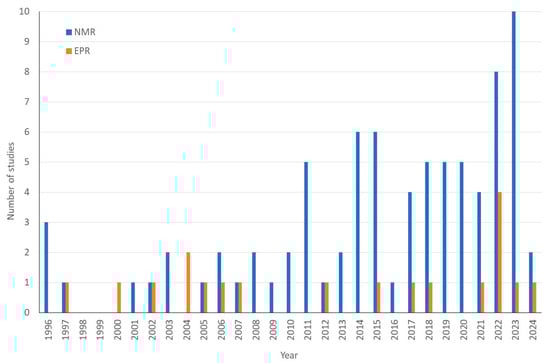 The EPR method has been successfully used in the study of SOM over the past decades since it is highly sensitive and provides extensive information on the molecular structure of compounds containing unpaired electrons. However, it is an order of magnitude less commonly used to study SOM than NMR (Figure 2). This is most likely due to both the specificity of the information obtained and the limited skills of researchers in working with the EPR method.