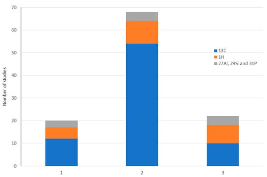 The vast majority of the studies analyzed were studies using 13C (69.7%) and 1H NMR (21.1%) spectroscopy (Figure 3). Note that the number of studies exceeded the number of articles included. This is because an article could include studies on several SOM or soil atoms (Table S1). This is not surprising, as these atoms form the main framework of SOM. However, over the last decade, there has been a noticeable increase in the number of articles investigating other atoms that are part of the SOM, and more and more articles have been published on the study of native soils and peat horizons. Authors are actively using NMR on the atoms 27Al, 29Si and 31P, which form the basis of the mineral matrix of soils.