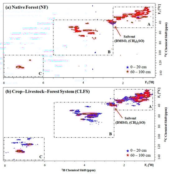 Two-dimensional 1H-13C heteronuclear single-quantum coherence nuclear magnetic resonance (2D 1H-13C HSQC NMR) spectra of HA samples extracted from (a) native forest (NF) and (b) crop–livestock–forest system (CLFS) at two different soil depths. Region labels correspond to the following: A = aliphatic; B = oxygenated aliphatic; and C = aromatic [38].