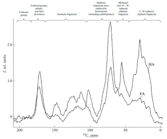 Typical solid-phase 13C NMR spectra (CP/MAS technique) of HSs, by the example of humic acid (HA) and fulvic acid (FA) preparations from the O (folic) horizon of Retisols [51].